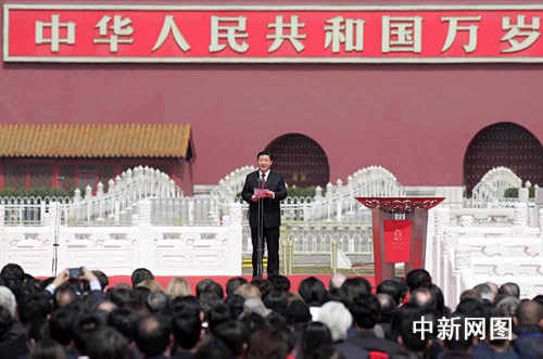 3月31日,北京奧運會圣火歡迎儀式暨傳遞啟動儀式在北京天安門廣場啟動。圖為習近平在儀式上致辭。中新社發 張宇 攝