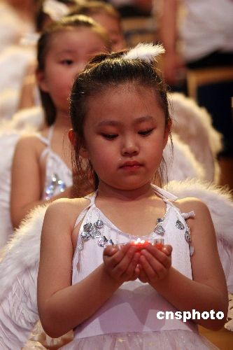 2008年5月19日,河南電視臺(tái)都市頻道舉行賑災(zāi)捐款晚會(huì),來(lái)自鄭州多所學(xué)校的小學(xué)生手舉“和平鴿”為四川地震災(zāi)區(qū)人民祈福。