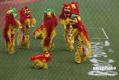 北京奧運(yùn)會(huì)棒球比賽舞獅表演。中新社發(fā) 武仲林 攝