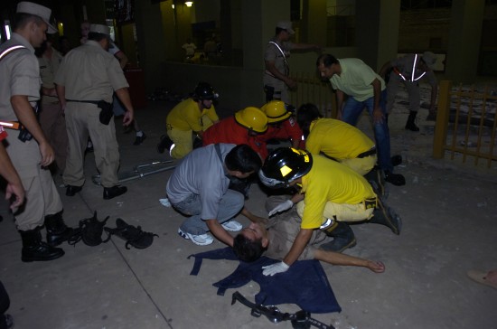 當時體育場內正在進行足球賽,體育館頂部水泥石塊突然坍塌,兩名防暴警察不幸身亡。比賽不得不暫停40分鐘。
