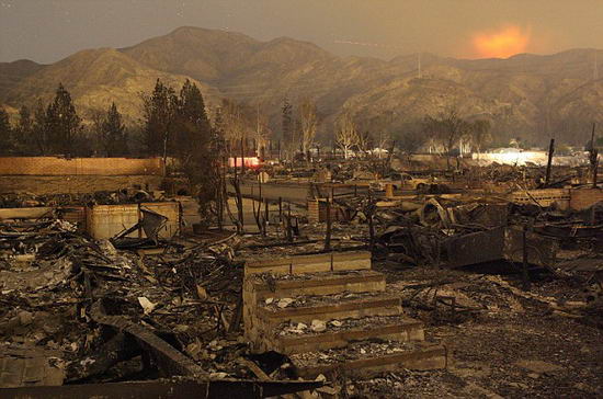 大火是上周四晚上在人口密集的圣費爾南多山谷燃起的,摧毀了數十間房屋,并對關鍵的電力供應線路構成了威脅。大火在風力的幫助下燒過干燥的山谷和山坡,熱風使當地溫度達到創記錄的30度。火勢在時速達112公里的強風的幫助下蔓延了2600英畝,迫使1萬名居民撤離,自上周四以來,過火面積已超過20000英畝,發生火情的地區包括洛杉磯北部的山丘、東南部的奧蘭治縣山谷、北部圣巴巴拉縣附近名人聚集的蒙特其托居住區。估計有1000套房屋被燒毀。加州州長施瓦辛格在視察火災造成的損失情況后稱:“對于南加州人來說,過去的幾天非常艱難。”