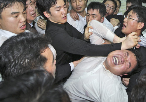在野黨議員與執政黨議員扭打在一起。