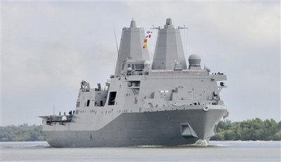 這艘軍艦是美國圣安東尼奧級船塢登陸艦的第六艘,全長二百零八米,船員二百九十名。來自世貿中心的鋼材于被用于制造“紐約號”上的兩棲登陸平臺,“它可以讓一支七百人的海軍陸戰隊在任何地方登陸”,美國海軍少校柯蒂斯·瓊斯說。目前“紐約號”的主要任務,正是將美國海軍部署到反恐行動現場。