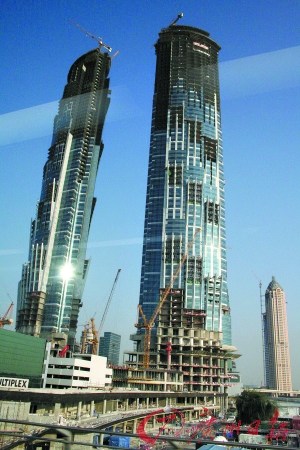 Burj Dubai可謂是樓市繁榮的見證,它簡直就是個大工地。各式摩天大樓爭奇斗艷,有的像雙子塔、有的像要騰空的火箭。連同高聳入云的迪拜塔,它們都有一個共同點:全部未對外開放,現場看不到施工者,大樓上的起重機也被晾曬在一邊。