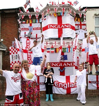 來自科爾福德的瑞安•奧德爾就將自家的房屋刷成了一幅巨大的英格蘭旗幟,上面還貼上了球隊的隊標,借以表達他對球隊的支持。球迷托尼•巴德斯則花了一周的時間將自家的房屋用各式各樣的旗幟遮了個嚴嚴實實。就連英國農(nóng)場的馬匹也都穿上了特制的英格蘭足球隊隊服,在草場狂奔。