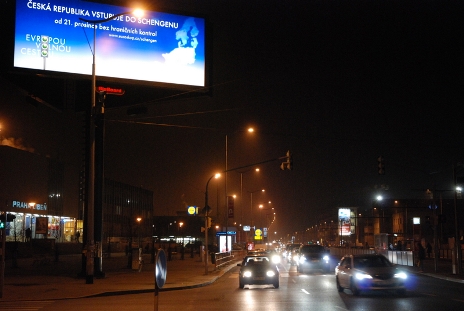 圖為捷克首都布拉格北面通向德國方向的交通要道一個路口上矗立的巨大廣告牌。設計者把捷文“穿行歐洲之路暢通無阻” 三個單詞中的字母“O” 巧妙地變成交通信號燈,而且三盞燈全是綠燈,喜悅之情躍然牌上。(黃頻)