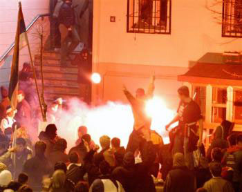 事件發生時,至少有15萬塞族示威者在貝爾格萊德市中心舉行集會,塞爾維亞總理科什圖尼察對示威者發表了譴責科索沃獨立的激情演講。大部分塞族人把科索沃視作塞爾維亞的宗教和文化發源地。