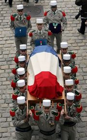 中新網3月18日電 綜合報道,法國政府17日為去世的第一次世界大戰最后一位老兵拉扎爾·蒙蒂塞利舉行國葬,以此向所有參加過一戰的法國軍人致敬。法國總統薩科齊和前總統希拉克17日上午在巴黎榮軍院參加為此舉行的閱兵儀式,全國各地政府機關和學校等建筑下半旗致哀。