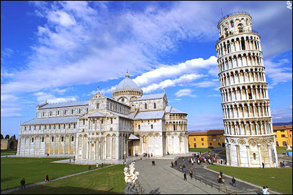 比薩斜塔重1.4萬噸,是一座獨(dú)立的鐘樓。自1174年分階段興建,至1370年竣工。因承襲了中世紀(jì)的建筑風(fēng)格及破格地采用圓形設(shè)計(jì)而成為意大利地標(biāo)。天文學(xué)家伽利略曾于比薩斜塔進(jìn)行實(shí)驗(yàn),因而發(fā)現(xiàn)了自由落體定律。