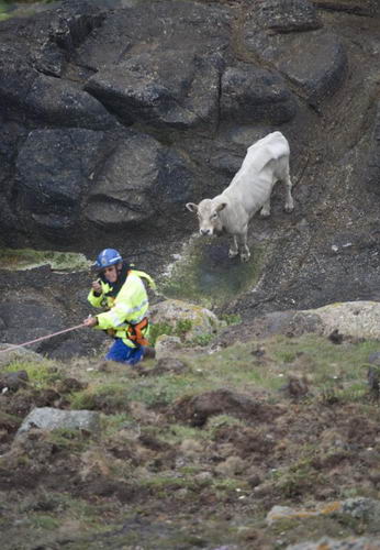 順繩索下到山澗的海岸警衛隊員給公牛帶來了食物和水。