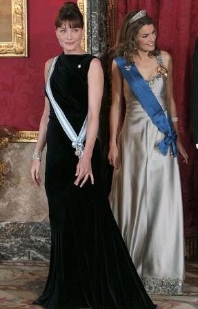 在會見西班牙王儲妃萊蒂西亞時,布魯尼身穿黑色長裙,頭發(fā)高高挽起,露出美麗后背,成為眾人矚目的焦點。但是王儲妃萊蒂西亞頭頂皇冠,一身淺色綢緞長裙,曳地閃閃發(fā)光,多少搶去了布魯尼的一些風(fēng)頭。