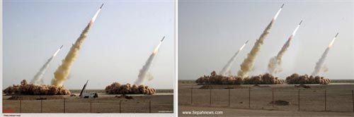 革命衛隊前天向包括以色列在內的世界各大傳媒發放了一批相片和錄像片段,在片段中其中一幕顯示3枚導彈以差不多角度射上天空,第4枚則仍在地上,可能因技術問題未能發射。但其中一張相片顯示在類似試射環境中,竟然多了一枚射上天空的導彈,而且地面的煙塵與最右邊的煙塵極之相似。