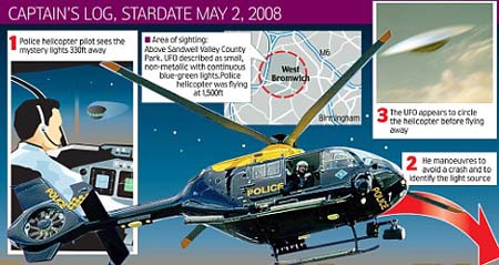 英國空中交通管制委員會21日發布的消息稱,2008年5月2日晚間21時50分,英國伯明翰警方的直升機正在城市上空進行例行的巡邏,他們突然發現前方不遠處的天空中有一個類似于飛碟的不明飛行物。這個外形怪異的不明飛行物體積并不龐大,并且持續不斷地發出藍綠色的光芒。直升機上的3名警察最初以為這是一架飛機模型,但隨后卻發現不明飛行物在向他們的方向飛了過來,最近的距離一度只有大約300英尺(約合91米),駕駛直升機的飛行員不得不立即改向進行回避。不明飛行物并沒有立即離開的意思,而是圍繞著英國警方的直升機飛行,看起來就像是在故意嘲弄和挑釁。伯明翰警方當時將這一情況用無線電報告給了英國軍方和空中交通管制部門。