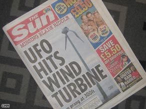 據(jù)CNN報(bào)道,本月8日 一個(gè)不明飛行物襲擊了英國(guó)林肯郡的一個(gè)小村莊,一個(gè)風(fēng)能發(fā)電機(jī)的扇葉被飛行物擊出了20米遠(yuǎn)。