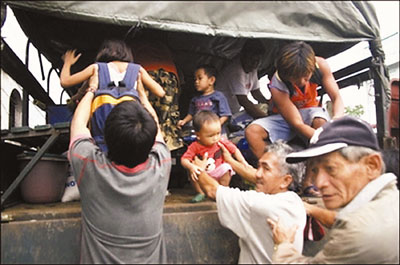 平板貨車、警方特許客貨車,甚至垃圾車均被征用接載災民離開(見圖)。總統阿羅約夫人縮短新加坡訪問回國。
