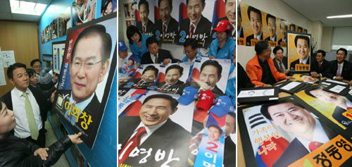 各候選人從選舉正是開幕的27日開始,將巡回全國,進(jìn)行激烈的游說戰(zhàn)。大國家黨候選人李明博,27日零時(shí)訪問了東大門市場,與商人約定激活平民經(jīng)濟(jì),以此揭開了正式的選舉運(yùn)動(dòng)。無派別候選人李會(huì)昌,上午參拜了韓國國立賢忠院后,在中區(qū)南大門選舉辦公室旁邊的草地上舉行“出征儀式”。大統(tǒng)一民主新黨候選人鄭東泳,當(dāng)天零時(shí)在全南麗水市廳與市民一起等待2012年麗水世界博覽會(huì)的申報(bào)結(jié)果,以此展開了選舉活動(dòng)。