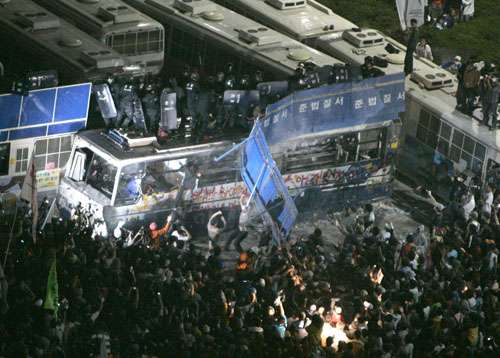 另外,韓國首都首爾昨天清晨的4萬人燭光集會示威演變成暴力沖突,延至日出后才平息。示威者用棍棒攻擊警員,又用梯子擊碎用作路障的防暴巴士的窗戶,并試圖推翻巴士,警方則以防暴盾牌還擊,據(jù)報雙方更曾在巴士車頂上開戰(zhàn)。組織示威者表示最少有20名示威者受傷,首爾大學(xué)醫(yī)院則指治療過6個人,已全數(shù)出院。據(jù)悉亦有警員受傷,及11名示威者被扣留問話。