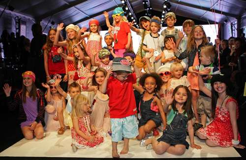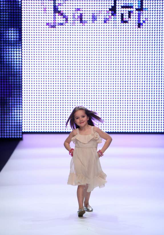 當日,小模特在T臺上展示童裝為時裝周開幕。