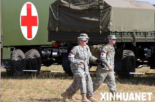9月4日,在蒙古國首都烏蘭巴托以西65公里處的蒙古國武裝力量培訓中心,參加多國維和演習的美軍醫療隊員從軍車旁經過。