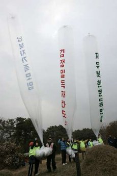10名韓國活躍人士周四(20日)放出10個氦氣球,每個氣球掛了1萬張批評金正日的傳單。