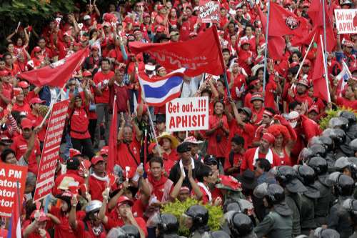 面對紅衫軍圍堵東盟峰會,阿披實政府的態度轉趨強硬,揚言要拘捕及起訴示威領袖。阿披實說那些頑固的示威者已經不能被曉之以理,一些人必須對目前的形勢負責,并稱“示威者已經顯示出他們想違反法律并引起社會混亂,所以我們將以刑事罪名對他們提起公訴。”
