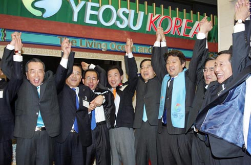 進(jìn)入大會(huì)場(chǎng)的韓國(guó)代表團(tuán)接到成功申博的消息后,在大會(huì)場(chǎng)旁邊焦心等待的申博團(tuán)和助威團(tuán)等600多人一齊高喊“萬歲”,慶祝麗水成功申辦世界博覽會(huì)。
