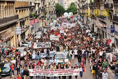 中新網(wǎng)5月16日電 法國(guó)公務(wù)員15日大罷工,抗議政府裁減公務(wù)員職位,全國(guó)有約100多場(chǎng)示威,上街公務(wù)員以教師為主,但亦包括醫(yī)院?jiǎn)T工、海關(guān)人員、稅務(wù)官員、文化界員工等。這已是總統(tǒng)薩科齊去年上臺(tái)以來(lái)第3次大規(guī)模公務(wù)員罷工,使其公務(wù)員體制改革再受挑戰(zhàn)。另外,工會(huì)已準(zhǔn)備下周四舉行更大型的罷工,會(huì)涉及更多行業(yè)。