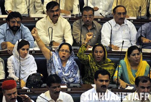 8月13日,巴基斯坦信德省的議員們在首府卡拉奇參加一次議會會議時高呼反對總統穆沙拉夫的口號。信德省議會當日通過一項議案,要求總統穆沙拉夫尋求信任投票。這是繼旁遮普省議會、西北邊境省議會之后第三個通過類似議案的省議會。 新華社/法新