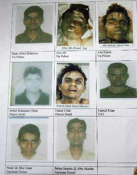 孟買警方首席調查員馬里亞向公眾展示嫌疑者的照片。馬里亞說,照片從犯罪嫌疑人尸體拍攝得來、或來自他們隨身帶著的身份證明。他說,嫌犯年齡介乎20至28歲,部分人曾化名接受訓練。