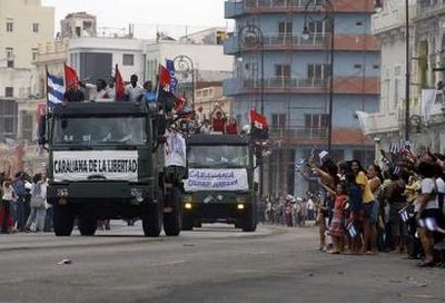 在厄瓜多總統(tǒng)柯雷亞的陪同下,古巴領(lǐng)導(dǎo)人、卡斯特羅之弟勞爾-卡斯特羅參加了在一處前軍事基地舉行的慶祝典禮。這處軍營(yíng)是卡斯特羅在1959年1月8日抵達(dá)哈瓦那后,向成千上萬歡欣鼓舞的古巴人發(fā)表演說的地點(diǎn)。