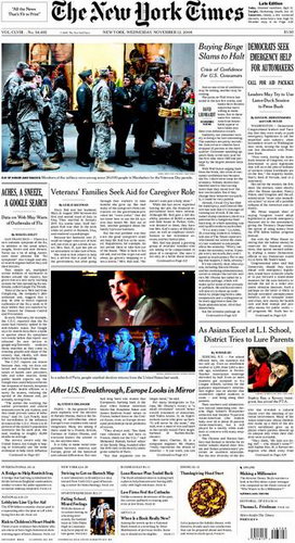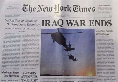 一個專門開展惡作劇活動的美國組織12日印刷了120萬份偽造的《紐約時報》。這份堪稱“惡搞杰作”《紐約時報》共有14版,無論是報頭還是字體字型,都和真正的《紐約時報》一模一樣,乍看上去簡直真假難辨。不過,這份報紙標明的出版時間為2009年7月4日,其頭條竟然是:伊拉克戰爭結束了。