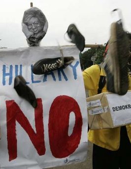 中新網2月20日電 美國國務卿希拉里亞洲之行18日到訪第二站印度尼西亞首都雅加達。由于前總統布什與穆斯林關系交惡,希拉里人還沒抵達雅加達,當地的美國大使館外就爆發激烈抗議,抗議民眾還以丟鞋子的方式,不歡迎希拉里來訪。