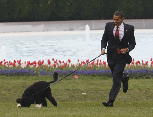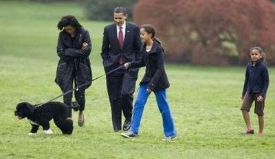 奧巴馬一家早前選定六個月大的葡萄牙犬“波”為白宮第一狗,他們首次在白宮南草坪放狗,“波”表現(xiàn)活躍,一對女兒很喜歡這只狗。