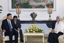3月19日上午,被廢黜的柬埔寨國家元首西哈努克抵京時,周恩來總理、葉劍英、李先念等國家領(lǐng)導(dǎo)人和友好國家的46位駐華大使到機(jī)場迎接。當(dāng)客人走下飛機(jī),周總理迎上前去緊緊握著西哈努克的手說:我們已經(jīng)知道柬埔寨國內(nèi)發(fā)生政變的情況,請您放心,您永遠(yuǎn)是柬埔寨國家元首,我們永遠(yuǎn)承認(rèn)您。親王在機(jī)場受到來訪的國家元首的最高禮遇。