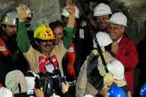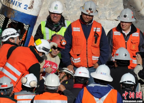 】智利圣何塞銅礦8月5日發生礦難,33名礦工在井下約700米深處被困超過2個月。經過設計方案、挖掘隧道等一系列準備工作,最后階段的救援于當地時間12日晚展開。智利總統以及多名智利官員到場迎接礦工出井。北京時間13日上午,首名升井礦工弗洛倫西奧•阿瓦洛斯搭乘特制救生艙回到地面,成功獲救,為最后階段拯救行動揭開序幕,所有被困礦工將被逐一送上地面,重獲新生。