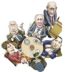 此外,現場也展出多幅諷刺時局的政治漫畫,包括有個小孩從本拉登的招牌長胡須中探出頭,以及以色列首相奧爾默特請辭,各主要政治領袖間合縱連橫的姿態,經漫畫家的詮釋,呈現諷刺的喜感。