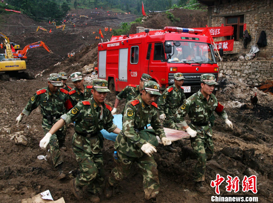 50個小時過去了,冒著山體隨時可能再次垮塌的危險,救援者從泥漿和碎石中搜救出六位被埋者的遺體。在30日下午發掘第五位失蹤者遺體時,在陽光下結板的泥漿和碎石讓官兵的救援行動異常困難,不到半小時間便敲斷了3根鐵鍬和一把榔頭。當失蹤者的遺體被挖掘出來裹上毛毯放上擔架后,記者看見旁邊手拿紅旗的一位武警戰士紅了眼圈。