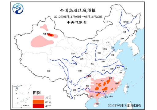中新網7月13日電 中央氣象臺7月13日18時繼續發布高溫藍色預警:預計,明天白天,重慶南部、貴州東部、湖南中南部、江西中南部、福建大部、廣東大部、廣西大部、海南北部、臺灣西北部等地有35℃以上高溫天氣,局地溫度將達37~38℃。