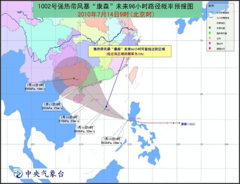 預計,“康森”將以每小時20公里左右的速度繼續向西偏北方向移動,未來有可能再次在南海海面加強為臺風,然后逐漸向廣東臺山到海南萬寧一帶沿海靠近,并有可能于16日夜間到17日下午在這一帶沿海登陸。