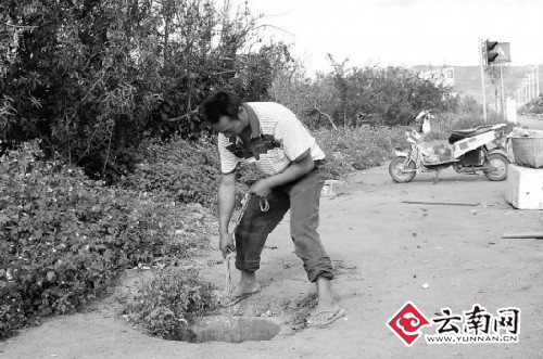 昨日下午,蒙自縣文瀾鎮(zhèn)高家寨的戴橋紅,正拎著一只水桶在紅河大道上找水,他找水的地方是紅河大道上的排污管道。在紅河大道的非機動車道上,許多窨井蓋都不見了,紅河大道兩旁的果農(nóng)們,每天都會開著車或者騎著摩托來找水。