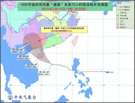 預(yù)計(jì),“康森”將以每小時(shí)15-20公里的速度向西偏北方向移動(dòng),強(qiáng)度還將有所增強(qiáng),有可能發(fā)展為臺(tái)風(fēng),將于16日中午到夜間在海南文昌到三亞一帶沿海登陸。