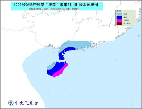 受其影響,15日晚上到16日白天,南海北部和中部、海南省及其沿海、瓊州海峽、廣東西部沿海、北部灣東部海面將有7-9級(jí)大風(fēng),“康森”中心經(jīng)過的附近海面或地區(qū)的風(fēng)力可達(dá)10-12級(jí);海南、廣東西南部將有大到暴雨,其中海南東部的部分地區(qū)有大暴雨,局地有特大暴雨。