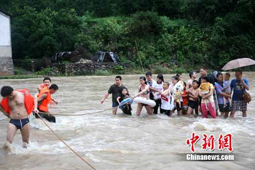 中新網衢州7月18日電(記者 江耘 通訊員 饒小飛)今天下午,浙江衢州石梁鎮坎底村水庫因暴雨致水位突漲,18名正在水庫里休閑渡假的游客被困水庫中央,其中7人是小孩。后在衢州柯城消防架設“安全通道”下,18名游客被安全救出。