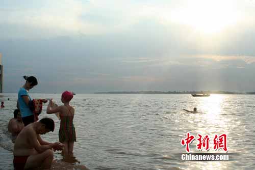 當天,九江天氣最高溫度達到37度,記者在潯陽江廣場旁看到不少當地市民在潯陽江(長江九江段)邊上游泳解暑,其中還有不少小孩和老人。