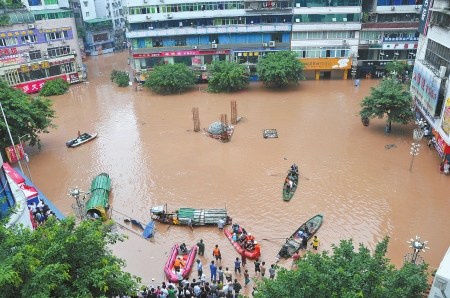 截至昨晚7點半,途經達州城區的洪水水位已達到282.61米,超過警戒水位4.7米,洪水使整個達州城超過1/3的面積進水,濱河路淹到二樓,全城大面積停水,逾5000家門市的貨物轉移。達州河市機場也進水。