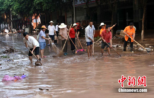 中新網廣安7月20日電(廖小兵 李勇) 20日凌晨,四川廣安城區160年難遇的洪峰慢慢消退,洪水過后,城區的清淤、防疫、災后安置成了當前抗洪工作的重中之重。當地迅速組織機關干部、公安、消防、武警、志愿者以及受災群眾近萬人迅速投入到清理淤泥、防疫工作當中,爭取早日恢復往日的生活秩序。