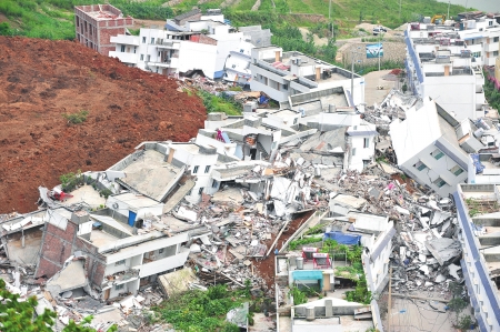 然而集鎮背后,高聳的大山被生生拉了一條“傷痕”——灰色的土石從山腰傾瀉而下,一直拉到集鎮的邊緣。土石經過的地方,所有的民房都被埋了進去。集鎮上靠近山坡的房屋,也有許多未能幸免。或被埋、或倒塌、或傾斜,剛剛建起的新房成了廢墟。經歷過“5·12”特大地震的當地人說,這些房屋的樣子和地震沒什么兩樣。