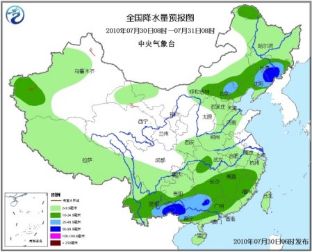 7月30日08時至31日08時,新疆西部、西藏中南部、內蒙古中東部、東北、華北北部、黃淮中南部、江淮、江漢大部、江南、華南以及川西高原南部、重慶東南部、云南、貴州等地有小到中雨或陣雨,其中,廣西大部、云南東南部、江西南部、福建西南部、遼寧、吉林中東部、黑龍江西北部及新疆天山西部等地有大雨,部分地區暴雨;上述地區局部并伴有短時雷雨大風等強對流天氣。新疆北部和東部、甘肅西北部、內蒙古東部、東北地區中北部等地有4~5級風。東海大部、臺灣海峽、南海西北部和南部、北部灣有5~6級南到西南風。