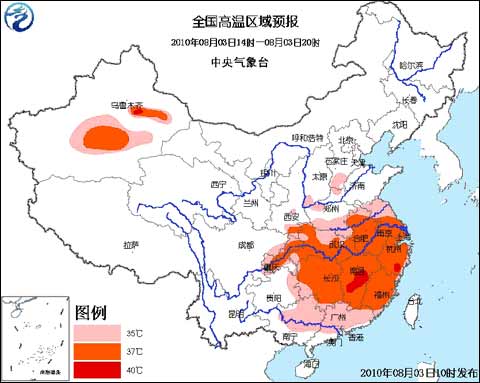 中央氣象臺2010年8月3日10時繼續發布高溫橙色預警: