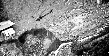 從機艙往下看,翠綠的山體上一道道灰白色的泥石流觸目驚心,曾經的美麗小鎮被泥石流拉開一道巨大的傷口。